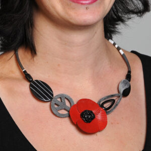 Collier coquelicot en fleur de cuir de vachette – elements perles en corne et résine
